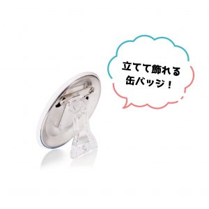 商品説明:ディスプレイ用のスタンドピン付き缶バッジです。稼働パーツで自立させることが可能です。